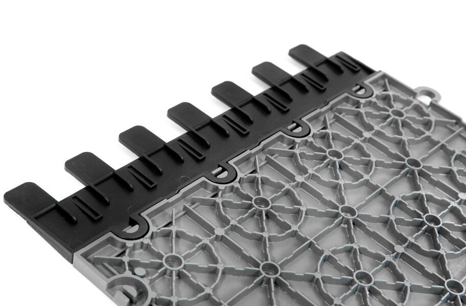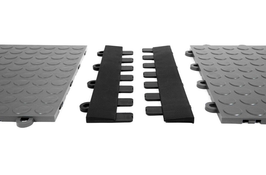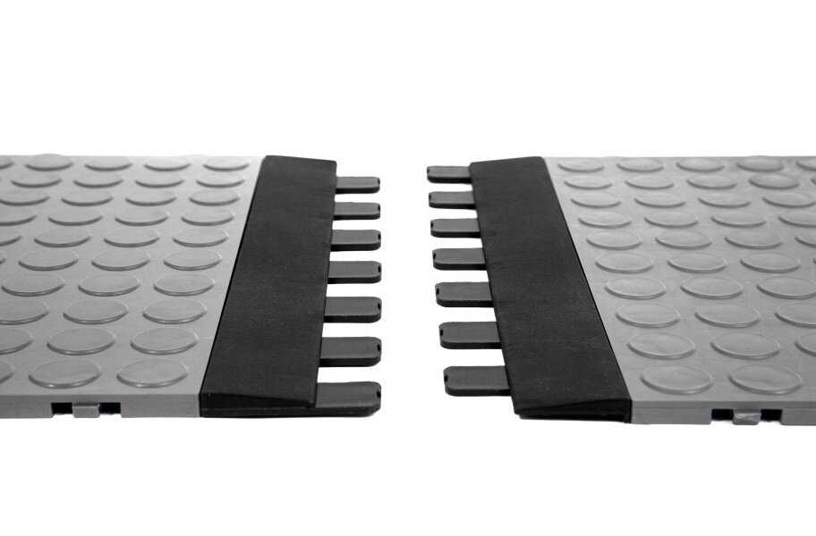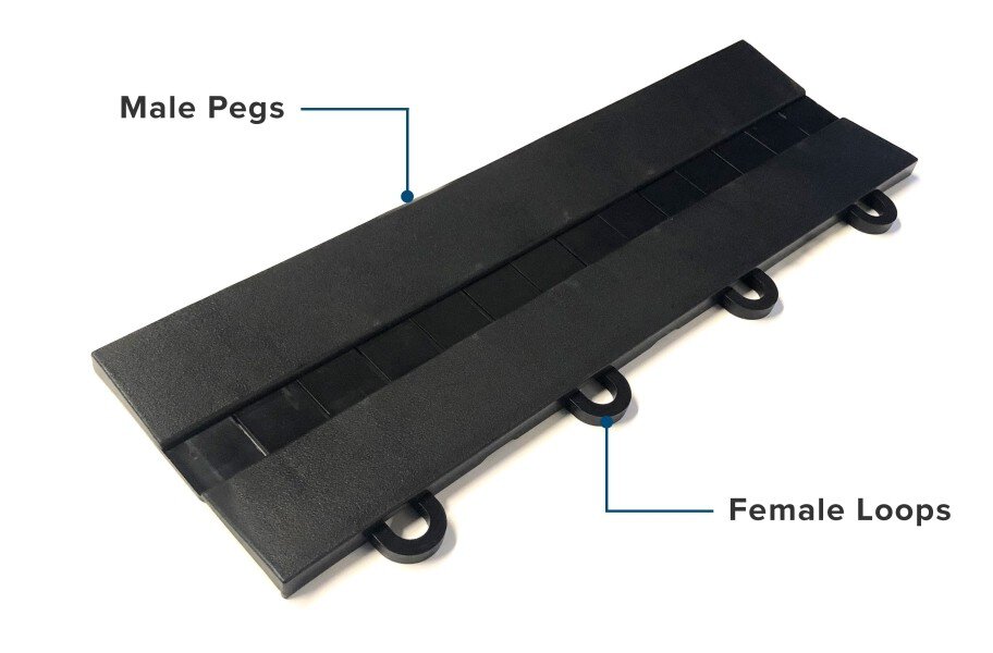 Installation of these floor tiles typically includes: Clean your sub floor so that it is free of all dirt, dust, grease, or other foreign material. When installing the hard plastic tiles, we recommend starting in the front left corner of the room and working your way out from there. Make sure the female side (loops) of the tile is facing away from the wall. After filling the left wall with tiles and the adjacent wall, proceed to fill the rest of the room with whole tiles. When you come up to a wall or object, don’t worry. Just measure the area and cut the tiles with a tile cutter or a power saw with a fine-toothed blade and put the trimmed tiles into place. When trimming the tiles into place, make sure you leave about a 3/4” space between the tiles and the wall or obstruction. Once the tiles are in place, you can then snap in the edge pieces, if you purchased them.