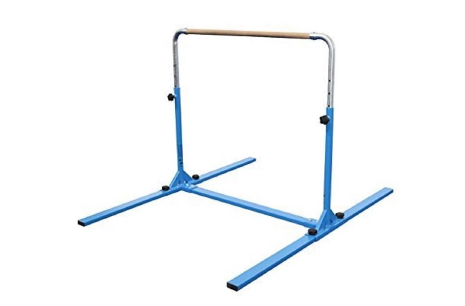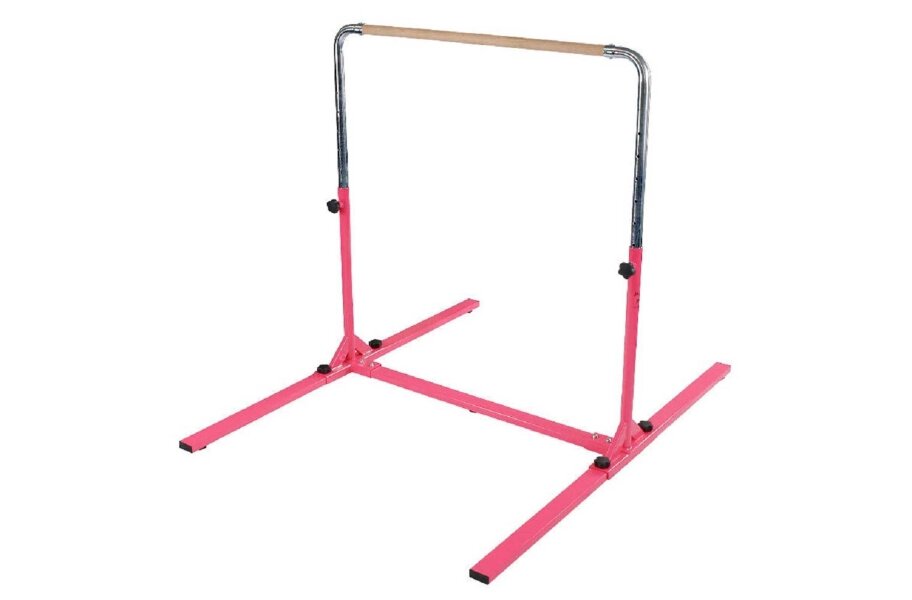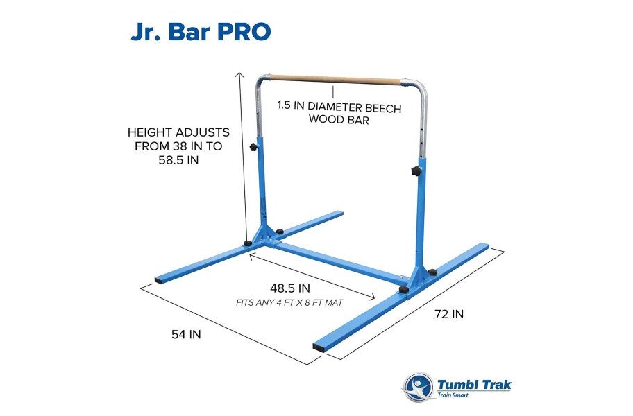 The Jr. Bar Pro is a trendy & colorful piece of equipment, perfect for both new and experienced gymnasts. The product is extremely versatile, well suited for different skill levels and age groups. The bar is easy to install and the height can be adjusted from 38" to 58-1/2". The product is sturdy and durable, making it easy to set-up and take down. Material - Steel construction with a smooth, tough powder coated finish & 1-1/2" solid beech wood bar. Size - 4' x 6' with an adjustable height from 38" to 58-1/2". Center cross support is 1-1/2" thick. Weight - 32 lb