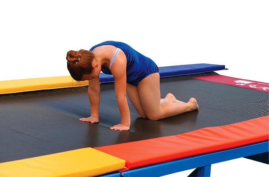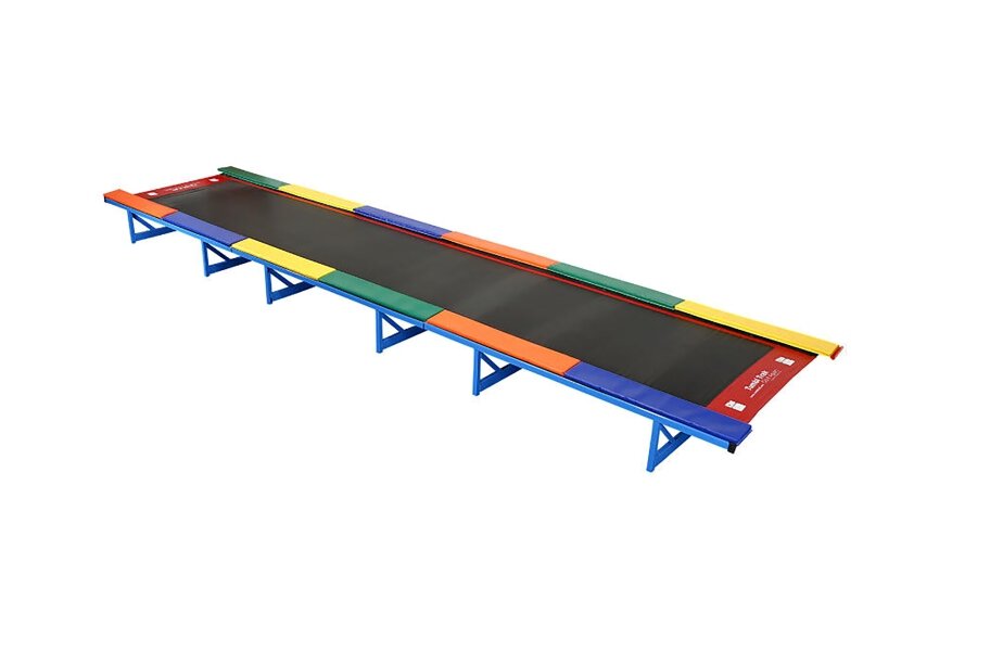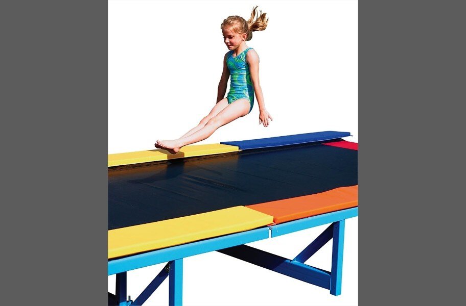 The Recreational Tumbl Trak is a fun and colorful tumbl trak specially designed for young gymnasts that weight 110 lb or less to practice simpler routines such as seat or back drops. The product was constructed to provide a gentle rebound on the recreational track to make the initial learning process easier. The recreational tumbl trak features a 6 inch mini tramp spring and a narrower bed with bright and colorful padding which makes it a great addition to any recreational or pre school class. It also comes with a velcro loop that allows the user to attach other items along the edge of the tumbling surface and measure their passes. Material - Bed is made of Polypropylene material with a heavy duty steel frame and high grade powder finish. Pads are made of knife coated vinyl and EVA foam. Width - Frame width is approx 6'(83"). Bed width is approx 4' (56"). Length - Available frame/bed lengths are 10', 15' 20', 25', 30', 40'. Height - Frame height is 1.75'. Weight - 7' x 10' weighs 225lbs, 7' x 20' weighs 385lbs, 7' x 30' weighs 480lbs, 7' x 40' weighs 605lbs, 7' x 50' weighs 755lbs, 7' x 60' weighs 1020 lb