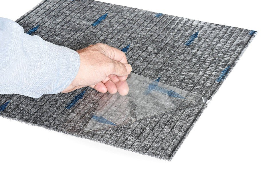 In wall to wall or rug installations, tiles can be loose laid and cut into place with a straight edge and a utility knife. Each tile has a self-adhering back that secures each tile to the floor without the need for glue, tape or tacks. If you do experience some movement and would like to ensure that the tiles do not slide at all, some double sided carpet tape can be used around the perimeter of the floor and directly under the seams of the tiles to prevent any movement.