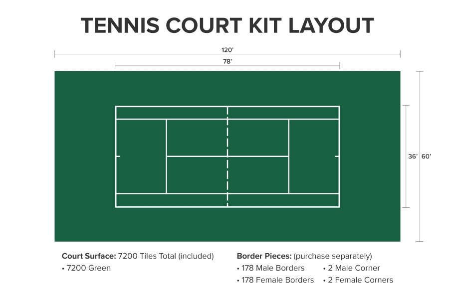 - Evergreen/Evergreen 60' x 120' Kit: 7,200 tiles (2,808 Evergreen for the playing area and 4,392 Evergreen for the outside area)