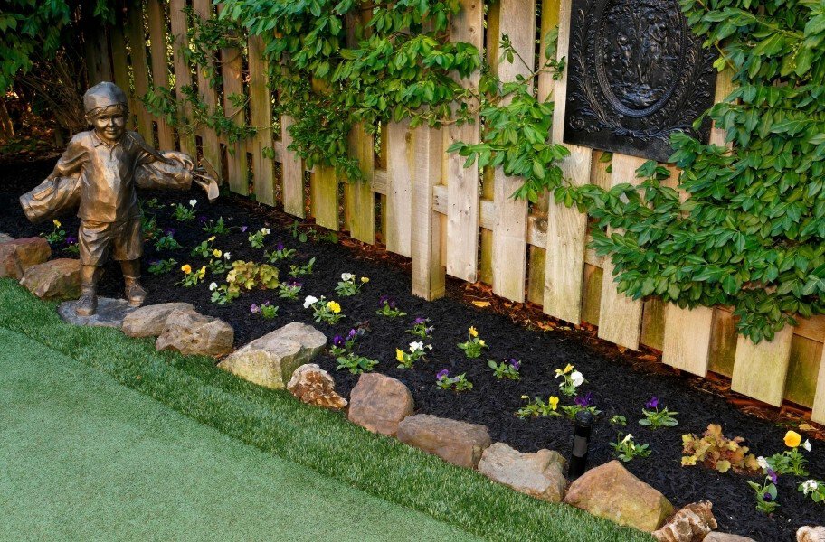 When installing our rubber mulch in plant beds, it is recommended that the beds have a border to help contain the mulch which can be a raised border (i.e., concrete or brick border) or a dug border or trench around the bed of about 2".