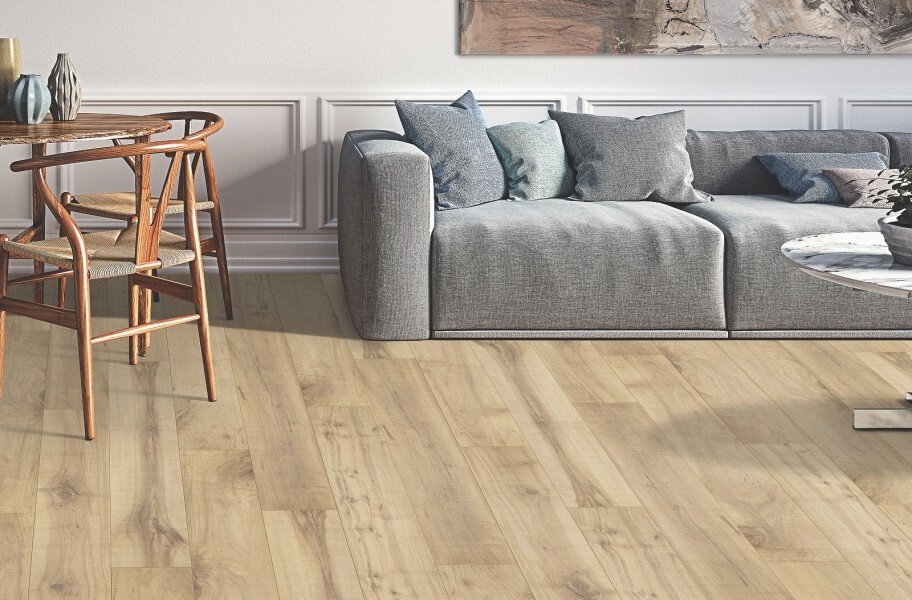 Mohawk Hartwick Maple laminate flooring provides your home with waterproof floors and exceptional wear resistance, all with the appearance of real Maple planks. Mohawk's RevWood Plus laminate floors are a perfect choice for waterproof wide plank wood flooring without having to worry about the integrity of your floors and are backed by a lifetime residential warranty. Each plank is embossed with real wood texture that matches the grain, giving your home beautiful Maple laminate floors that are also tough against scratches and stains. RevWood Plus laminate flooring from Mohawk is designed give you extremely tough floors and an appealing real-wood finish that is easy to clean and maintain. Each plank comes with a Hydroseal covering that helps repel water and prevent swelling from moisture.