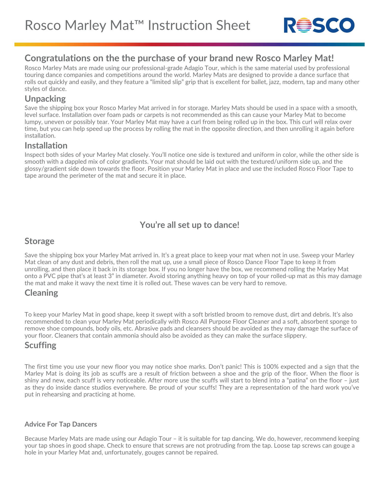 The professional grade Rosco Adagio Tour™ Marley material used to make the Rosco Marley Mat™ Home Dance Floor Kit is great for ballet, jazz and modern, and also has enough rigidity to produce a good sound for tap and other styles of hard soled dance. This durable, and highly portable dance floor is great for all dance styles. Whether you're a beginner or a seasoned dancer, Rosco Marley Mat™ Home Dance Floor will provide the ideal foundation for your dance practice. Experience the Rosco difference and elevate your dance journey.