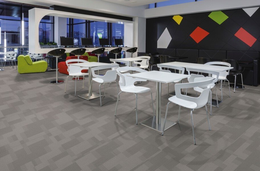 Pentz Amplify Carpet Tiles are a highly versatile commercial grade carpet tile featuring a geometric pattern with colorful accents. The color palette is a neutral base with vibrant accents that coordinate with Pentz Colorburst Tiles, allowing for limitless creative design possibilities. These color and pattern combinations have the power to drastically transform any space, creating a range of design options from subtle to bold. These stain-resistant carpet tiles feature premium Nexus® Modular Backing System and have a TARR rating of 3.5, ideal for rigorous use areas. This commercial carpet also meets common safety requirements and features a lifetime warranty for wear, stain removal, delamination and colorfastness to light. Amplify is also available in a 12" x 48" plank format.