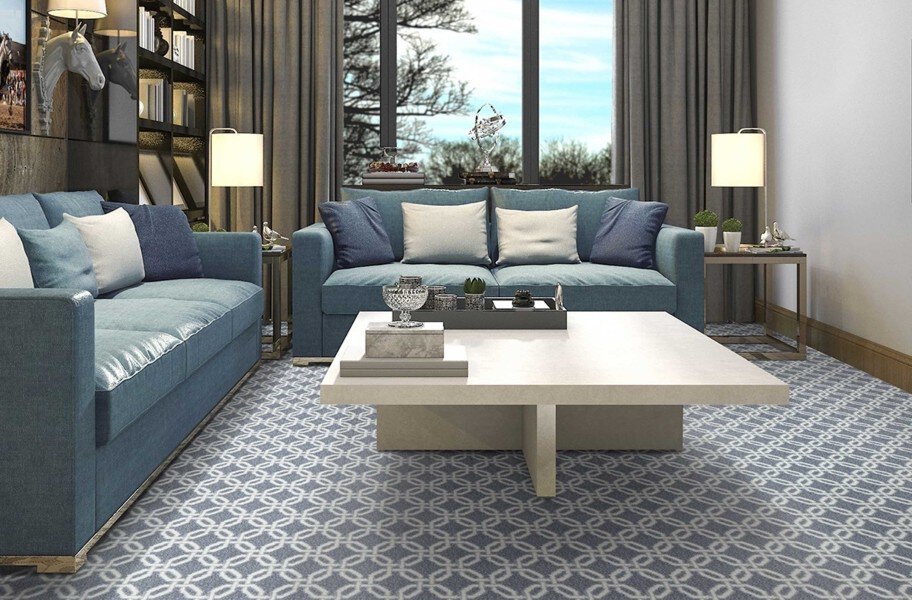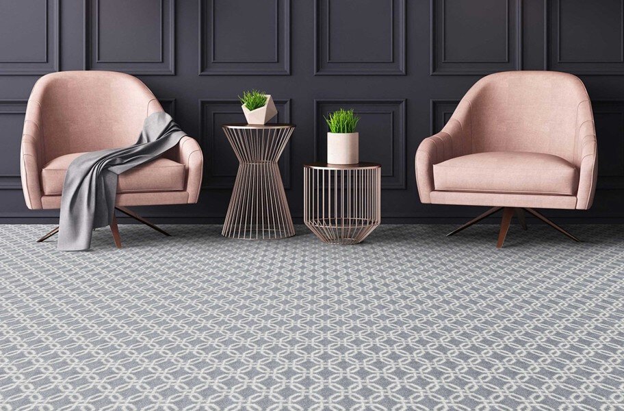 Elevate your interior design aesthetic with Joy Carpets Intersect Carpet from the Impressions® Collection. This versatile geometric print carpet features an interlocking pattern on a backdrop of neutral contemporary tones. This durable broadloom carpet is easy to clean and maintain, making it perfect for high traffic spaces. For assistance in placing large orders, please contact our service team.