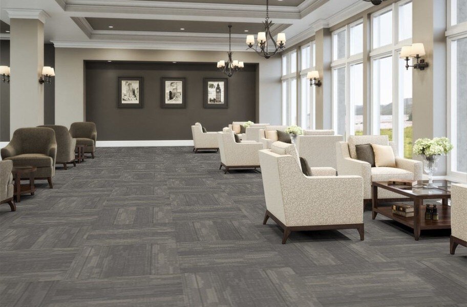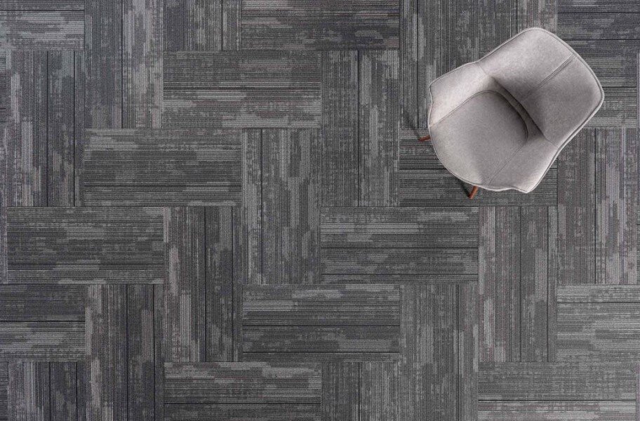 J & J Flooring Fast Track Carpet tiles feature high-performance construction and a textural pattern that will bring modern interiors up to speed. The blurred imagery of acceleration is reflected in Fast Track - when speed distorts shape and color that meld into shifting linear tones. These eco-friendly floor tiles are composed of 42.95% recycled materials and are also backed by a lifetime warranty with proper installation. These tiles are very easy to install, only needing Tile Tabs to hold the tiles together, and can be installed in both residential and commercial environments.