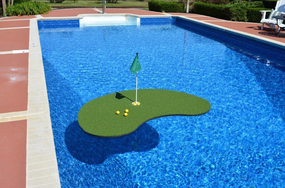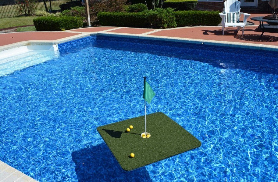 Our Golf-Elite Floating Putting Green Mats are the perfect addition to any pool party or lake event. No assembly required! Simply add the included regulation size cup and flag and throw it in. Use the included floating golf balls for target practice without worrying about sinking. This lightweight and portable mat can be taken anywhere. This is the perfect gift for any golf lover! Each mats includes a small chipping pad, 12-floating golf balls, regulation size cup and flag. Material Nylon with a foam backing Color Green Width See sizes below Thickness Approx .75" Face Weight Approx. 40 oz Weight See weight below Application Indoor/Outdoor Drainage Yes Length See sizes below UV Stable Yes Made in USA Heat & Frost resistant Yes Size - Our Floating Putting Green Mats are available in the following sizes: 3'x3', 3'x4', 4'x6'. Weight - Our 3'x3' mat is 12 lb, our 3'x4' mat is 14 lb, our 4'x6' mat is 22 lb