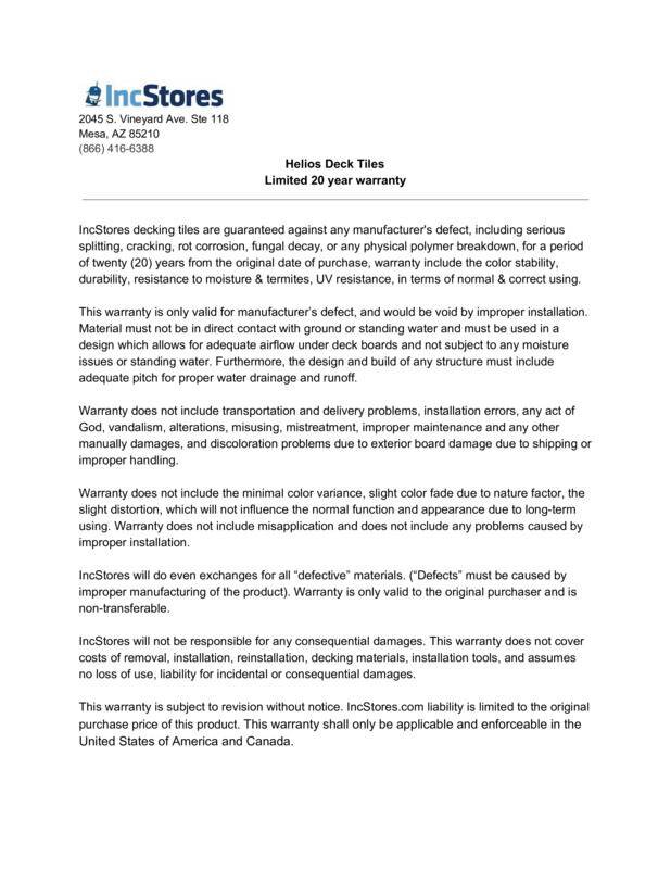 The ultimate in DIY-friendly composite decking, Helios Composite Deck Board Tiles are the perfect blend of style, durability, and sustainability. Crafted from durable, eco-friendly materials, these lightweight weatherproof deck tiles offer the stunning aesthetic of real wood without the maintenance. Enjoy a beautiful, hassle-free deck or patio with this sustainable outdoor flooring solution. Designed to withstand the elements, Helios Composite Deck Board Tiles are slip-resistant, fade-resistant, and resistant to insect damage and scratching. Each interlocking deck tile is incredibly strong, supporting up to 1,623.12 lbs. Plus, they come with a 20-year warranty for added peace of mind. For a unique touch, mix and match with artificial grass tiles to create a vibrant, green space. Upgrade your patio, deck, or poolside area today and experience affordable luxury with Helios Composite Deck Board Tiles!