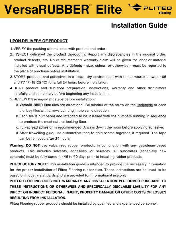 | banner msg int | Warranty: Pliteq Flooring warrants that VersaRUBBER® ELITE, when installed according to its recommended procedures and adhesives (Pliteq Polyurethane Adhesive), will be free from manufacturing defects during regular use for 10 years from the original installation date. For more information, please reach out.. |