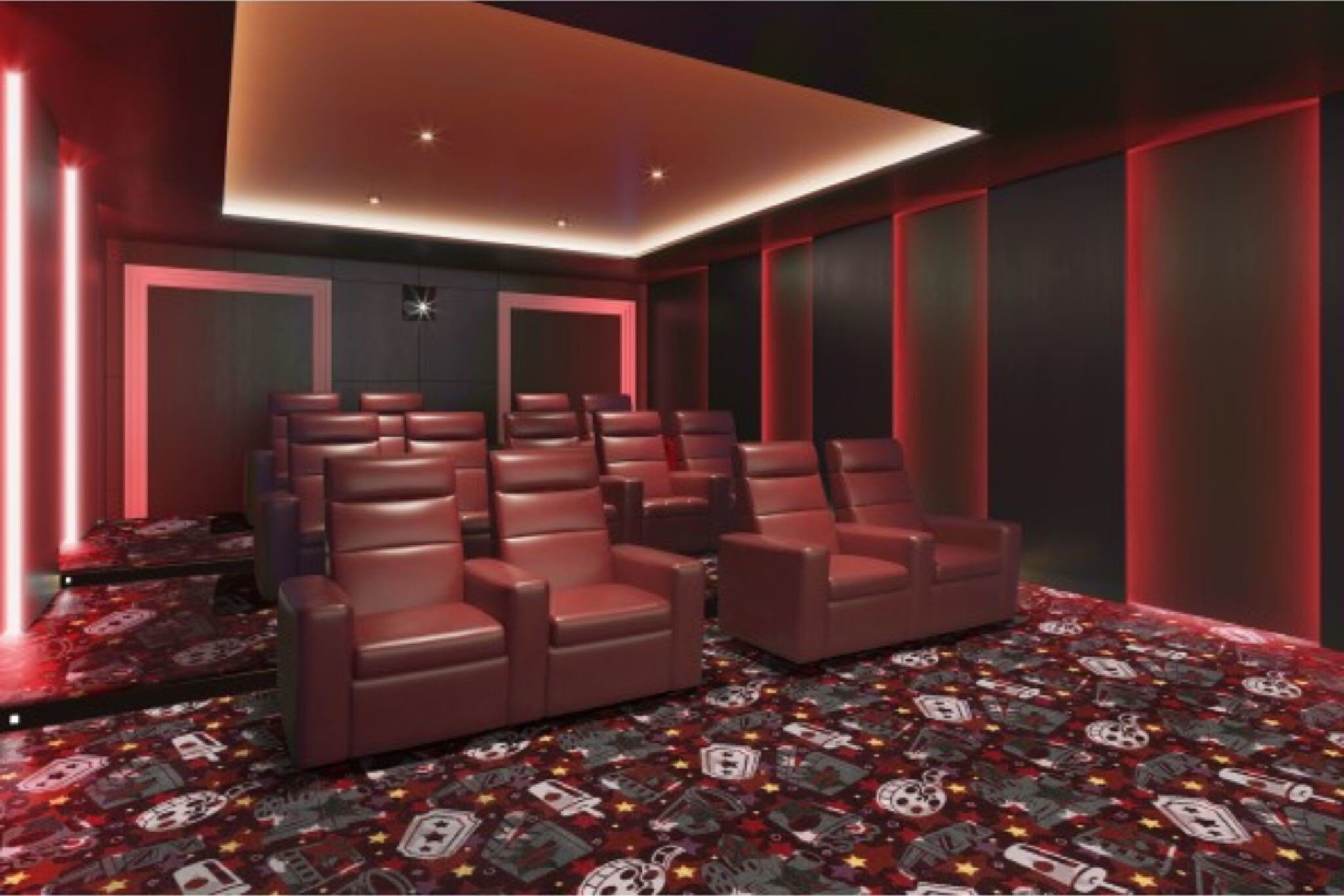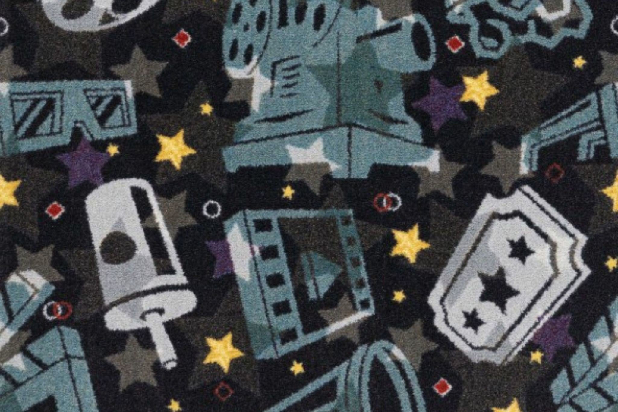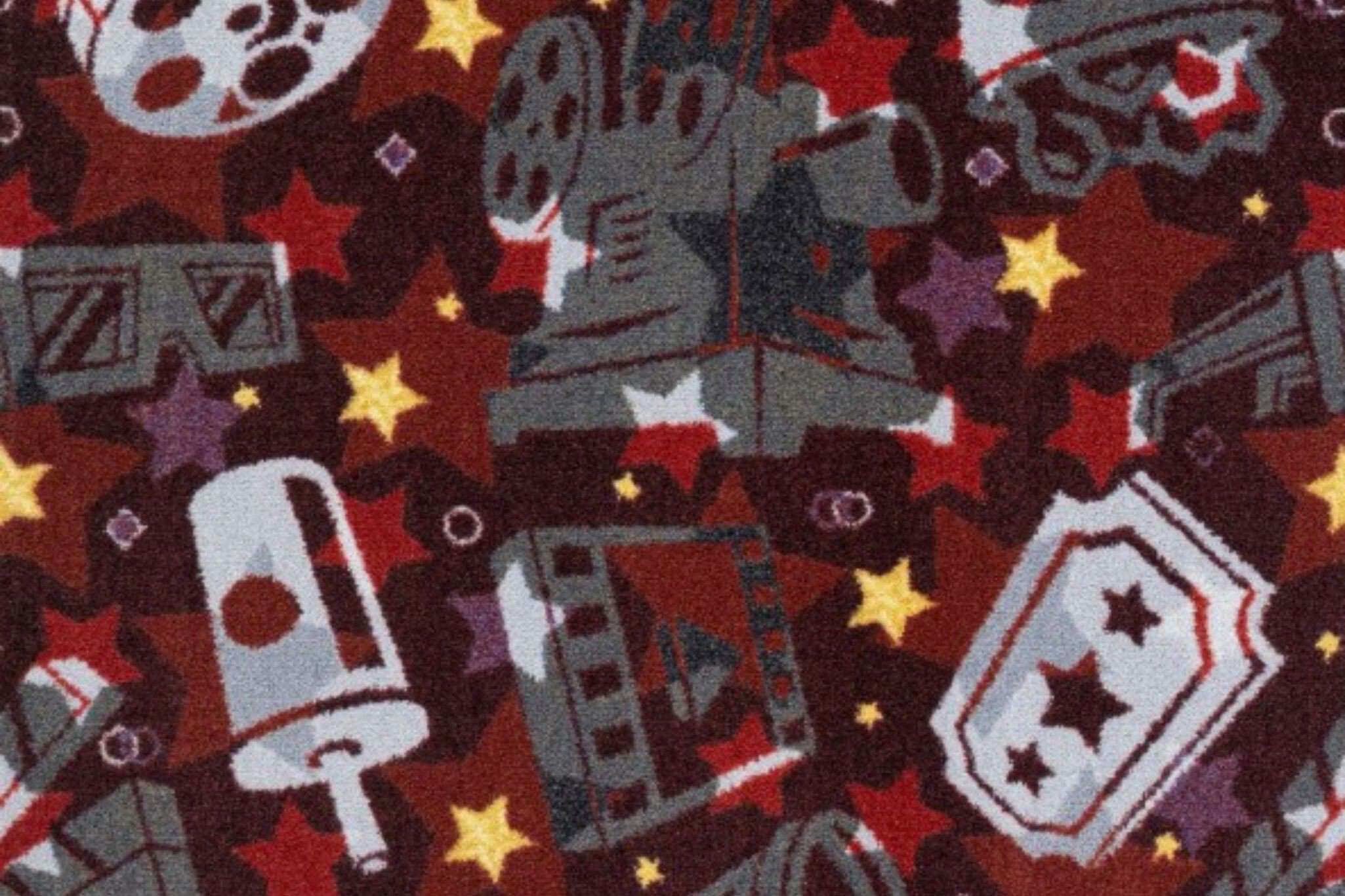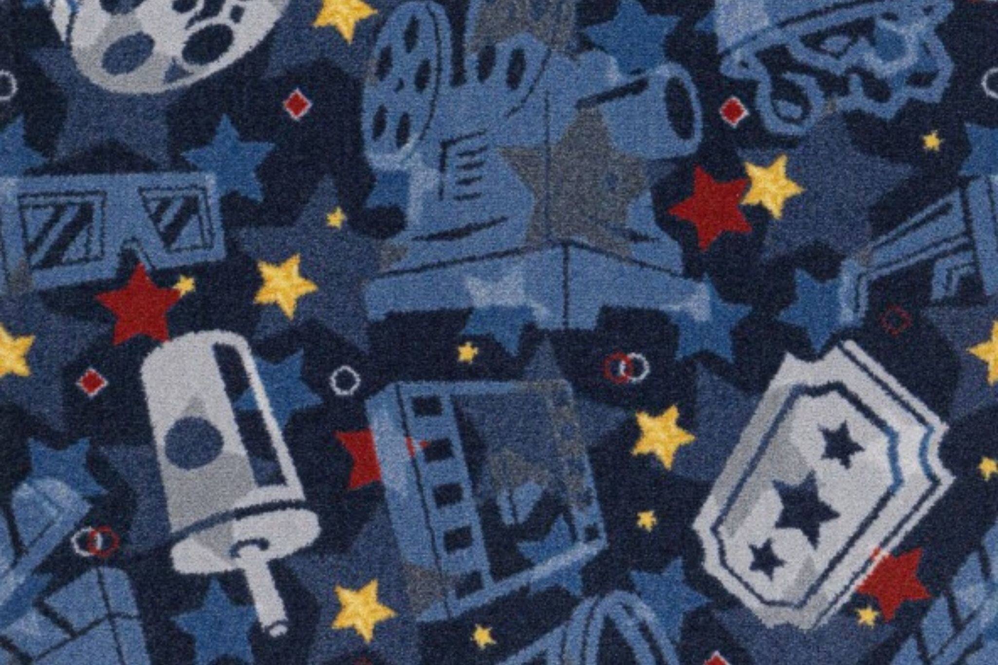 Celebrate the magic of movies with the Joy Carpets Motion Picture Carpet, a playful patterned carpet featuring classic film reels, tickets, and stars in a fun, nostalgic layout. Ideal for home theatre and movie theater spaces, this bold broadloom design brings cinematic charm to media rooms and entertainment areas. Crafted in the USA using durable WearOn® Nylon, it offers long-lasting stain resistance, vibrant color, and resilience under heavy use. This CRI Green Label Plus certified carpeting supports better indoor air quality and installs easily with 13'6" wide carpet rolls. Make your space feel like a true screening room with this lively and durable home theater carpet.