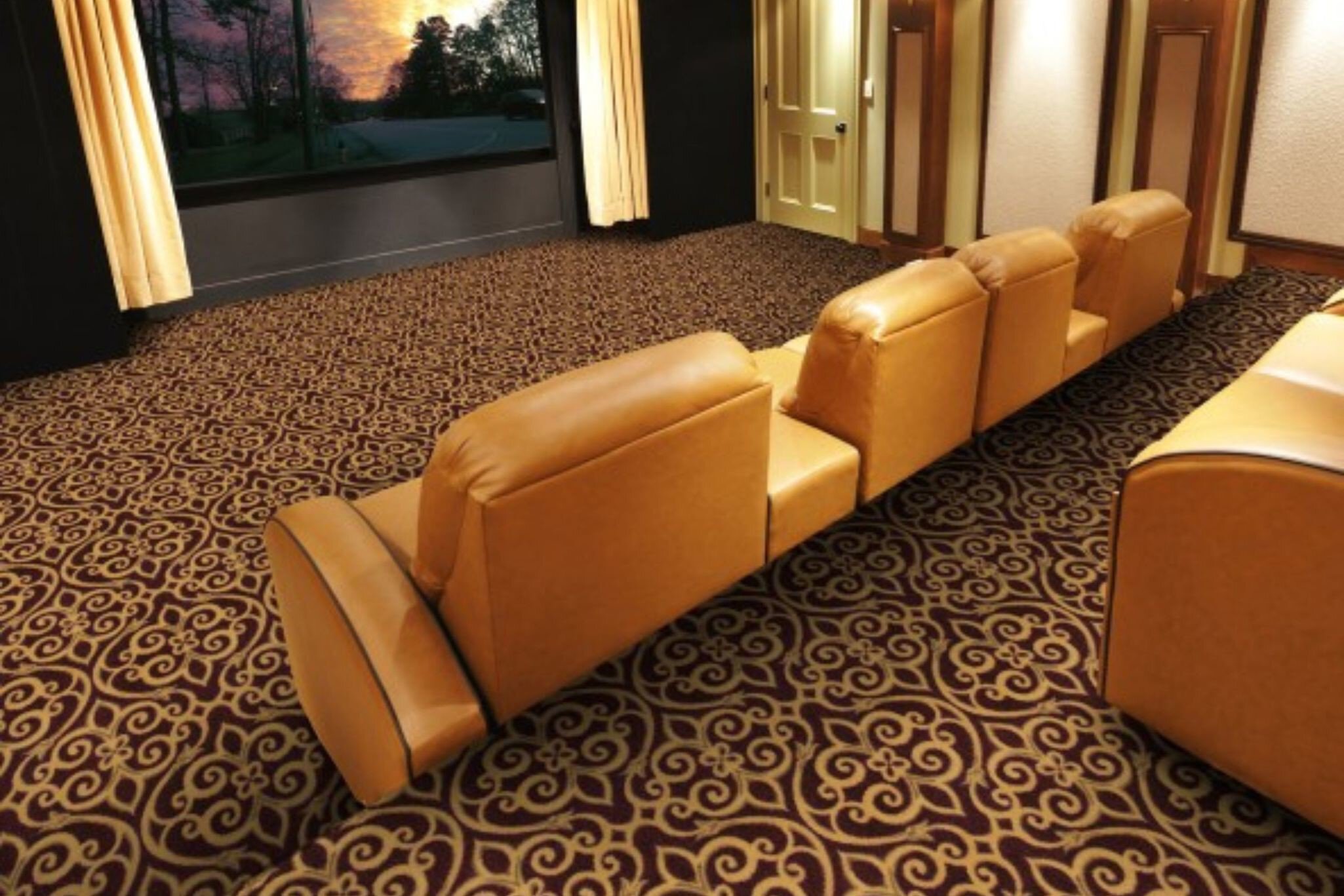 Add timeless elegance to your home theatre or movie theater with the Joy Carpets Cathedral Carpet, a luxurious patterned carpet inspired by classic architectural motifs. This refined broadloom design features rich textures and graceful detailing, ideal for creating a sophisticated ambiance in media rooms and upscale entertainment spaces. Woven in the USA from premium WearOn® Nylon, this high-performance carpeting offers superior stain resistance, color retention, and durability for high-traffic areas. CRI Green Label Plus certified, it contributes to healthier indoor air quality and is available in convenient carpet rolls for easy installation. Choose this elegant home theater carpet to elevate your space with a look of quiet grandeur and lasting comfort.