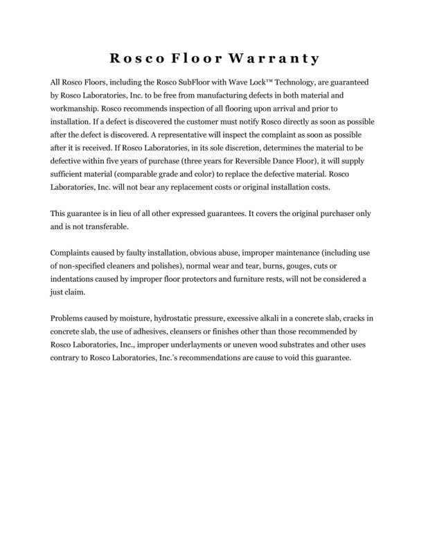 Proper preparation of your sub-floor is essential to the long-term health of your Rosco Dance Floor. All screw heads, nails and other hard edged protrusions should be removed or covered prior to the installation of your Rosco Dance Floor. These materials can damage your floor beyond repair and cause injury to dancers. Fill cracks in the sub-floor with an appropriate filler and sand smooth.