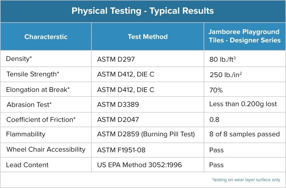Recommended Uses: These tiles have been used successfully in school and park playgrounds, community playgrounds, daycare centers, skateboard parks, under rock climbing walls, as deck and patio flooring, indoor and outdoor walkways, and paths, on rooftops, and other areas where a fall absorbing rubber surface would be beneficial.