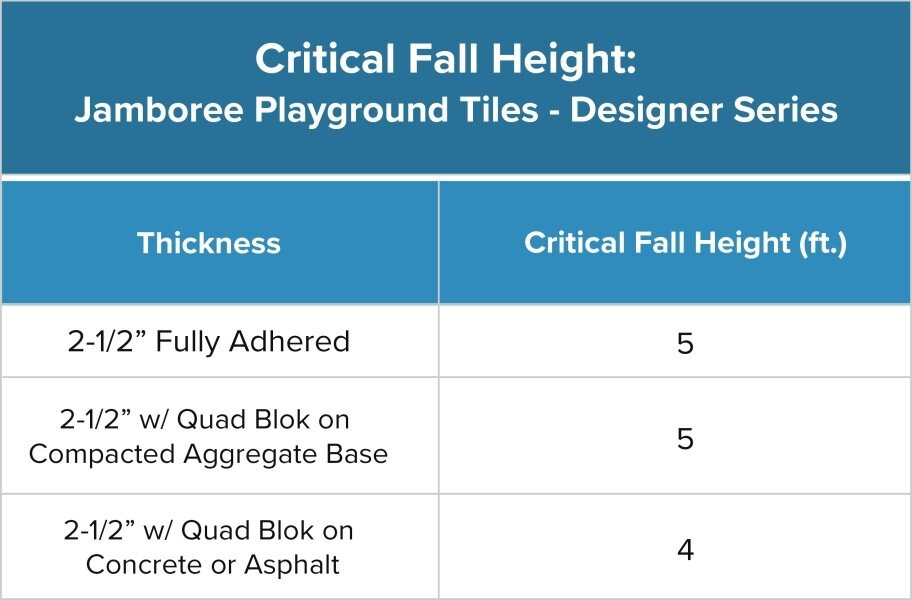 - Quad Block connectors do not work with the 4.25" thick Jamboree playground tiles in the designer series. When purchasing the 4.25" thick rubber playground tiles, a full glue-down installation is the recommended installation procedure.