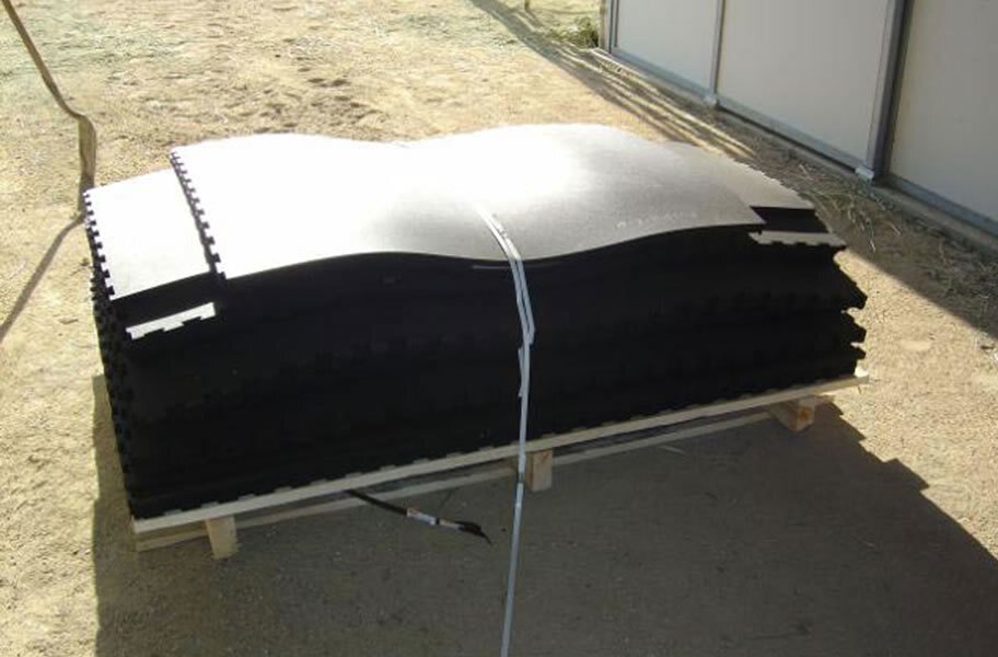 Material - Diamond top interlocking mats are constructed of recycled crumb rubber from used car tires that is then vulcanized. Vulcanization means that the interlocking stall mats are heated back together under pressure to form one solid non-porous mat rather than a rebounded mat, which is essentially glued back together. This is the process that forms the strongest and most long-lasting recycled rubber mats or floor products available.