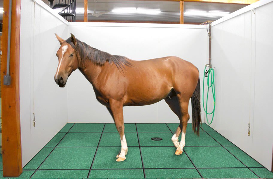 Horse Stall Tiles offer a long lasting rubber floor covering system for use in horse stalls, wash bays, breeze ways, and walk ways around barns or stables. These 1" thick recycled rubber tiles are available in a flat top or brick top pattern and are easy to install. Horse stall tiles also offer a slip resistant and shock absorbing surface to help protect foals. These tiles are water permeable to allow for fast drying and include a 5 year manufacturer's limited warranty. Note: This is a custom order product. 30-Day Money Back Guarantee does not apply. Material - Each tile is made from recycled rubber from California recycled tires to provide a green flooring solution. Size - 24" x 24" Thickness - Available in 1.00" thick tiles. Weight - Each tile weighs 17.75 lb and each ramp accessory piece weights 4.8 lb Origin - Made in USA