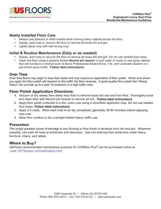 Maintenance of the floor typically includes: Daily or weekly vacuuming or dust mopping of dirt, grit, dust etc. Use felt pads under chair and furniture legs to prevent scratching of the flooring surface. Place door mats at all entrances to prevent tracked in dirt, rocks, moisture, and other debris. Avoid using rubber backed mats as they can stain the flooring surface over time. When mopping, use a damp and never a wet mop. Clean up spills immediately to prevent damage to the floor.