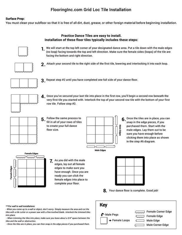 - We will start at the top left corner of your designated dance area. Put a tile down with the male edges (no loop) facing towards the top and left direction. Make sure the female sides (loops) of the tile are facing the bottom and right direction.