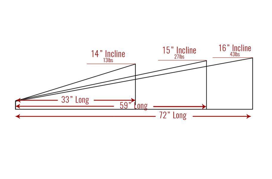 Material: Crosslink Polyethylene foam encased with 18 oz vinyl fabric. Size: 14" incline mats are 24" wide x 33" long, and 15" incline mats are 29" wide by 59" long when folded.