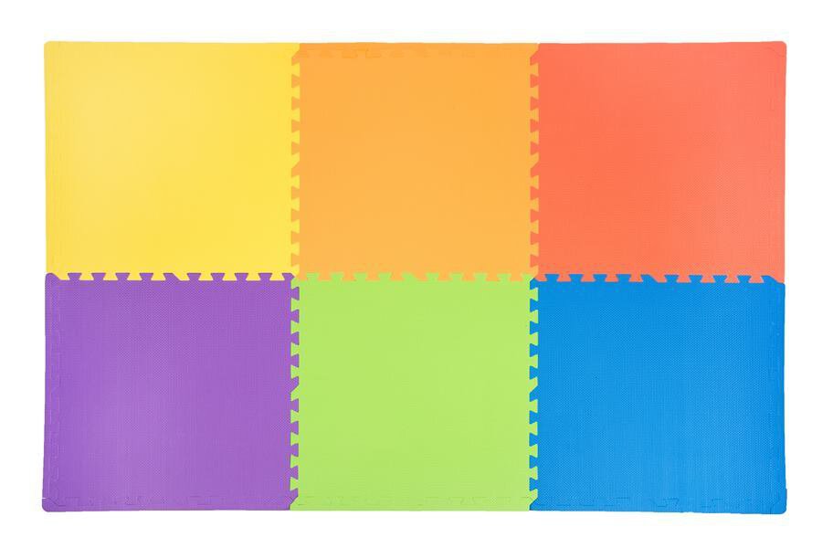 Our popular Rainbow Foam Play Mat is sold in a 6-pack of fun, brightly- colored foam floor tiles that kids and parents will both enjoy. These 100% kid-safe, non-toxic, latex-free, and non-allergenic interlocking foam tiles are perfect to create a portable play mat that provides safe cushioning for babies and toddlers or when used as wall-to-wall floam flooring for bedrooms or basements. Each colorful foam tile in our Rainbow Play Mat set comes with two removable edge pieces that create portable foam mats with a clean finished edge. This allows you to turn any tile into a corner, border, or center tile. Each mulit-color pack of 6 foam floor tiles covers approximately 24 sq ft .