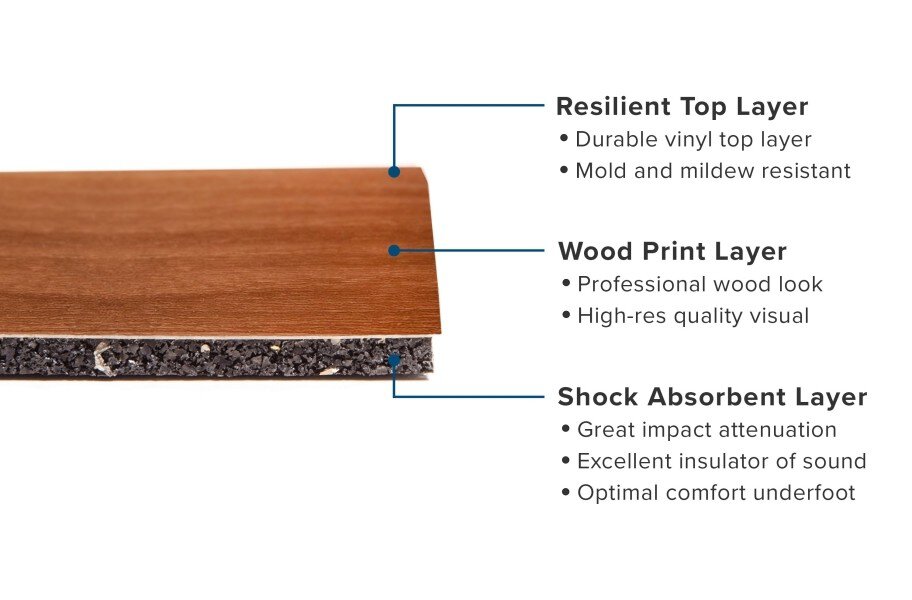 Material: 2 mm virgin vinyl layer over a 5 mm recycled rubber underlayment.