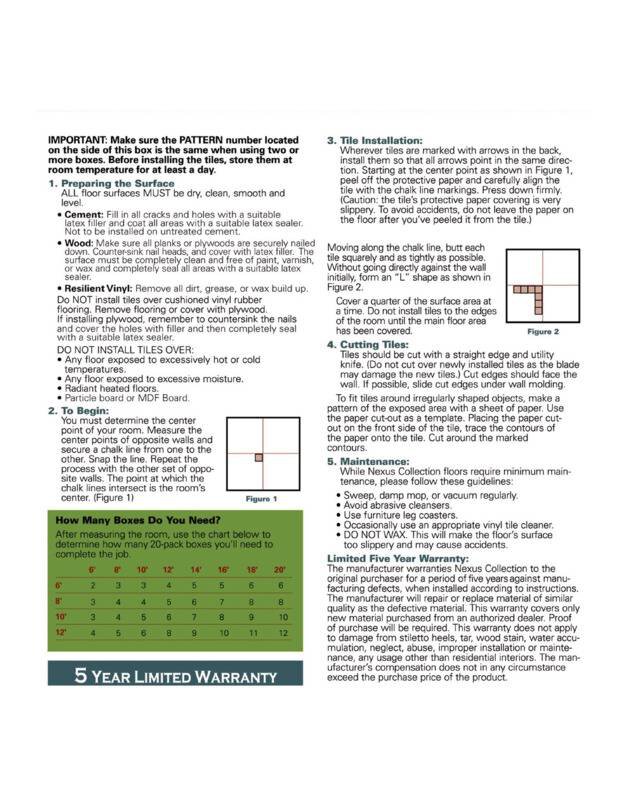 Luxury Vinyl tiles and planks are easy to keep clean and maintain. Always use plywood or other boards when moving heavy objects across the floor to avoid scratching of the floor surface. Use felt pads under chair and furniture legs to prevent scratching of the floor surface. Place walk off door mats at all entrances and doorways to collect debris from shoes such as dirt, rocks, and moisture, from being tracked in and onto your new floors. Avoid using rubber backed area rugs or floor mats as they can stain the flooring surface over time. Use non-staining floor protectors underneath heavy furniture, chairs, and tables. Daily or weekly vacuuming or dust mopping to remove dirt, grit, dust etc. Do not use treated dust mops. When mopping, use a damp and never a wet mop. Clean up spills immediately to prevent damage to the floor.