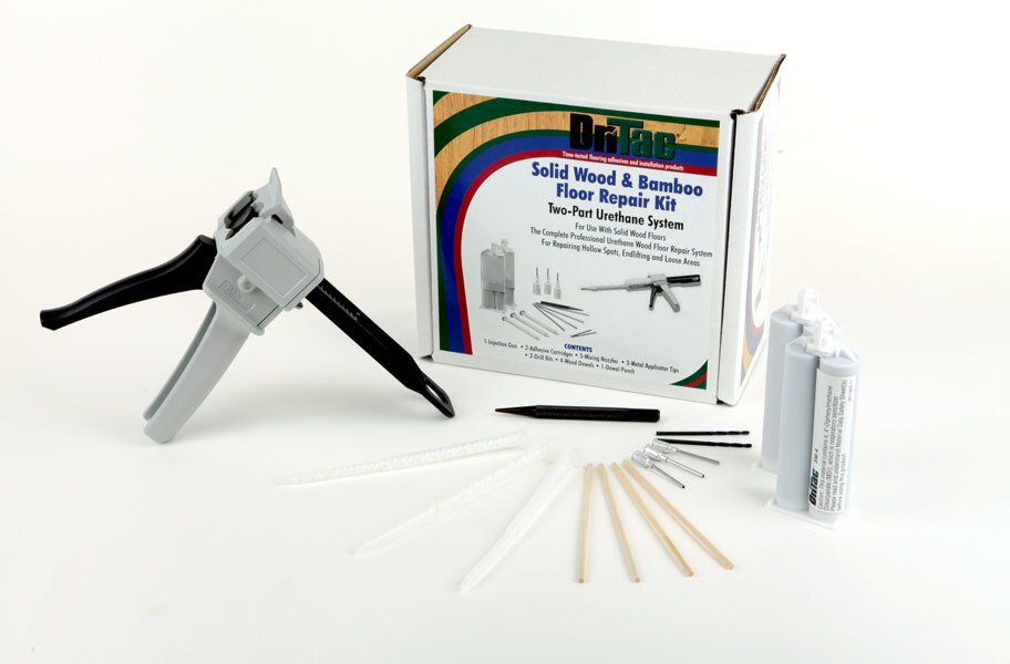 Our solid wood and bamboo floor repair kit helps to correct voids that occur between the flooring and the subfloor. Easy to use for both professionals and DIYers, this floor repair kit will help to eliminate hollow spots and popping conditions in wood flooring installations. Contents - 1 Injection gun, 2 adhesive cartridges, 3 mixing nozzles, 3 metal applicator tips, 2 drill bits, 4 wood dowels, and 1 dowel punch. Weight - 2 lb