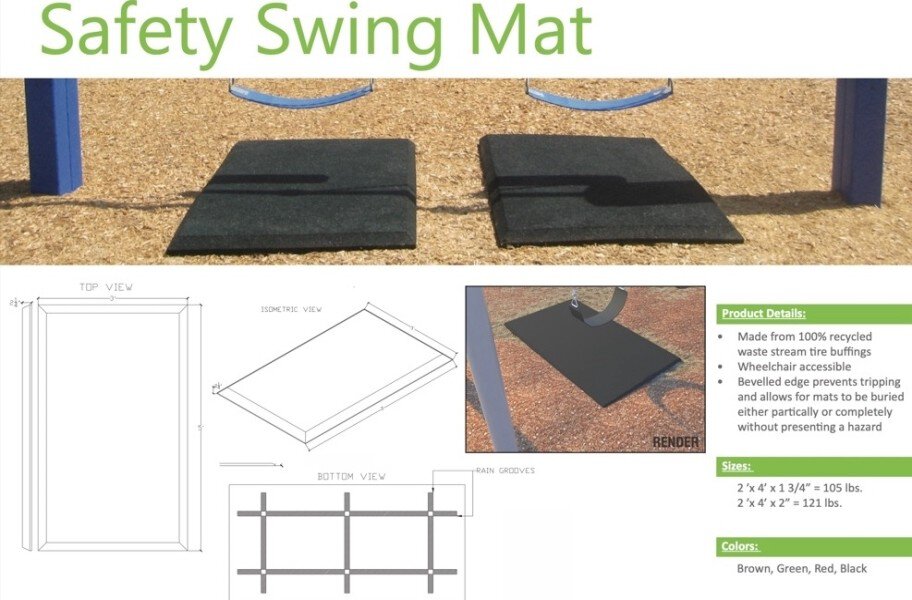 Swing Safety Rubber Playground Mats are great for both residential and commercial playgrounds and provide added protection and ease of maintenance under swing sets by helping to prevent the spread of mulch, gravel, and dirt. These 2" thick rubber safety mats are certified with a fall height rating of 4', providing added peace of mind when your children are reaching for the stars. These heavy-duty rubber swing mats weigh about 122 lbs. each, which helps to make them vandal safe, and also gives them the needed stability for aggressive and high traffic play areas. The wheelchair-accessible beveled edge prevents tripping and allows these durable rubber mats to be buried either partially or completely without presenting a hazard. Swing Safety Rubber Playground Mats are very easy to install and maintain, are American made, and backed by a 5 year warranty.