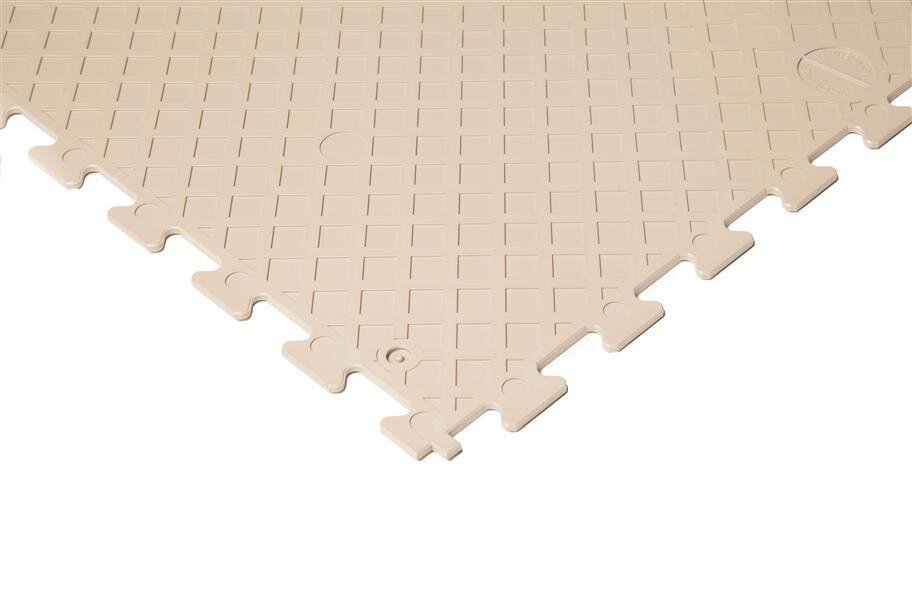 Installation of interlocking tiles is very simple and typically done by the consumer. Typical installation of these tiles is as follows: First, clean your sub floor so it is free of all dirt, grease or debris. Snap a chalk line on the sub floor 24” from one wall in your room. Snap another chalk line on the subfloor 24” from an adjacent wall. You should now have a pair of perpendicular lines making an approximate 90-degree angle. Begin laying the interlocking tiles along the chalk lines, snapping the locks together as you go. Leave the perimeter of the room open until the field is installed. After the field is covered, go back and cut in lines along the walls in the room. Leaving a gap at the wall roughly the thickness of tiles being used is recommended to account for expansion and contraction of the floor tiles in varied temperature ranges.