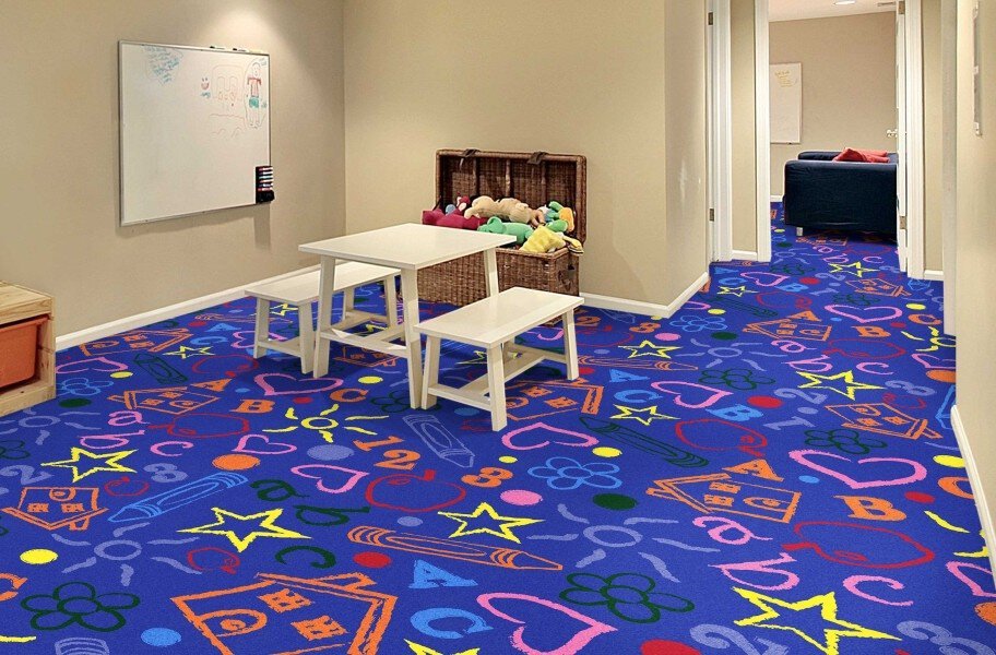 Joy Carpets Kid's Art carpet features colorful, large graphics that resemble the endearing artwork of children. With bright and fun abc's, crayons, and shapes 'drawn on, ' this durable, stain-resistant carpeting is perfect for any space meant for little ones. Suitable for residential and commercial use, Kid's Art carpet is American Made and is easy to clean and maintain - all the more reason to love it.