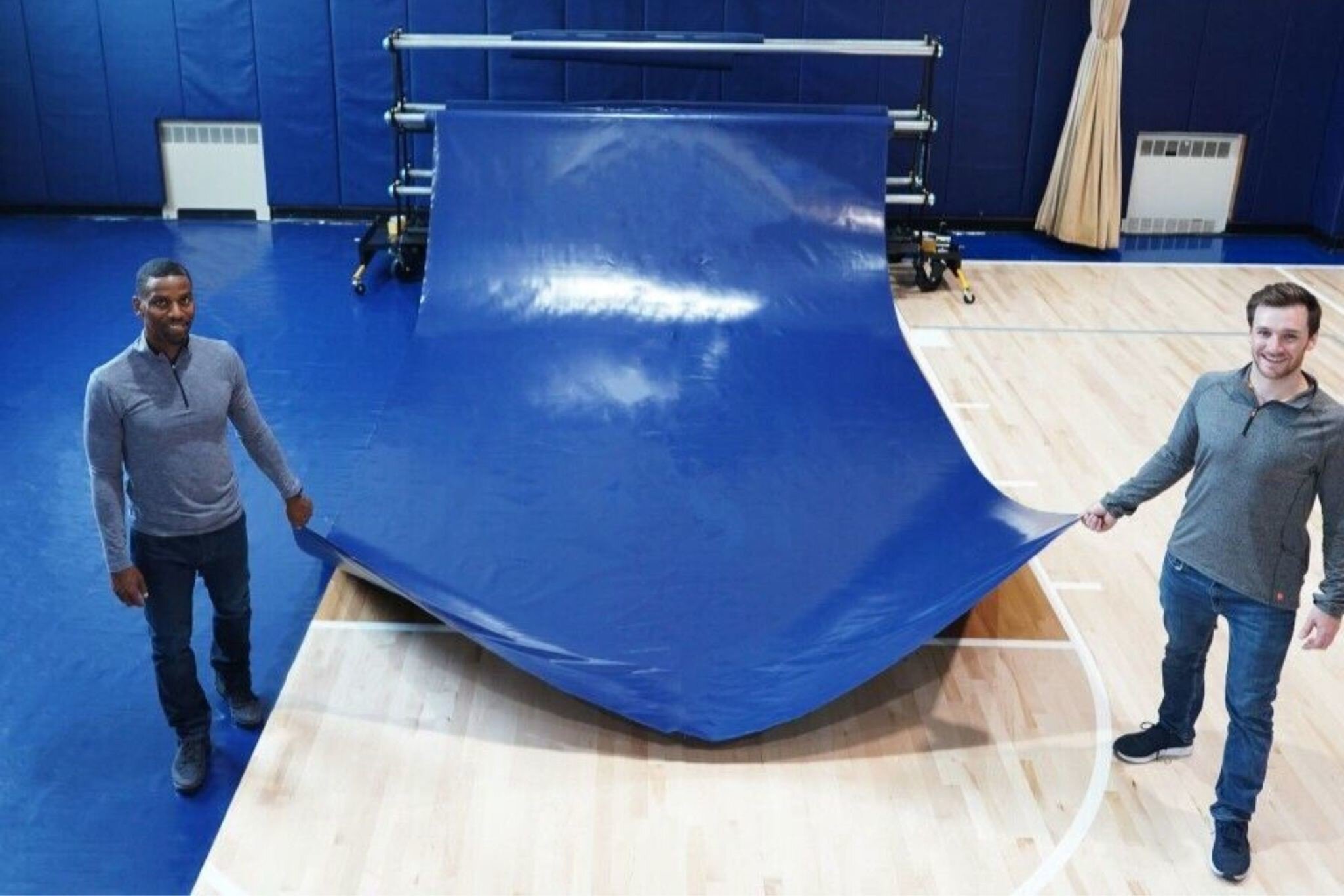 - Begin by rolling the full rack to one corner of the gym floor. Lock it into place with the wheel brakes before loosening the yellow safety bar on each end of the roll. Each person can then grab a corner of a cover roll and together walk the cover section down the length of the floor.