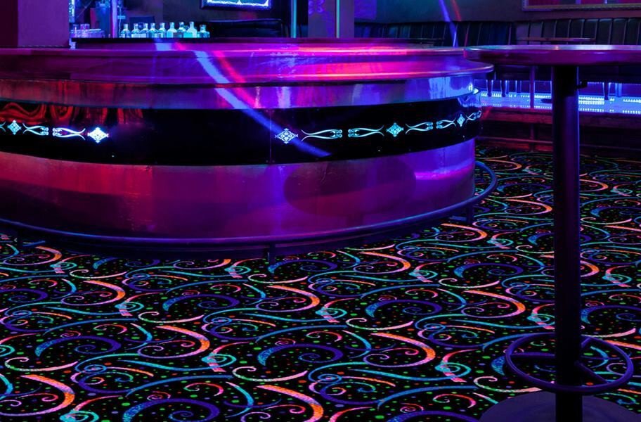 Joy Carpets Neon Arcade Carpet – Dynamo energizes any space with its bold, glow-in-the-dark design that pops under black light. Ideal for use as arcade carpet, bowling alley carpet, game room carpet, home theater carpet, movie theater carpet, and more, this USA-made patterned carpet combines style and durability for both commercial and residential settings. Offered in 12' wide carpet rolls for easy installation, Dynamo’s vibrant colors and energetic pattern create a lively atmosphere that keeps guests engaged. Made from premium nylon, this broadloom carpeting resists stains, handles heavy traffic, and maintains its brilliance for years. Whether you’re outfitting a club, entertainment venue, or personal media room, Dynamo is the perfect foundation for high-impact style.